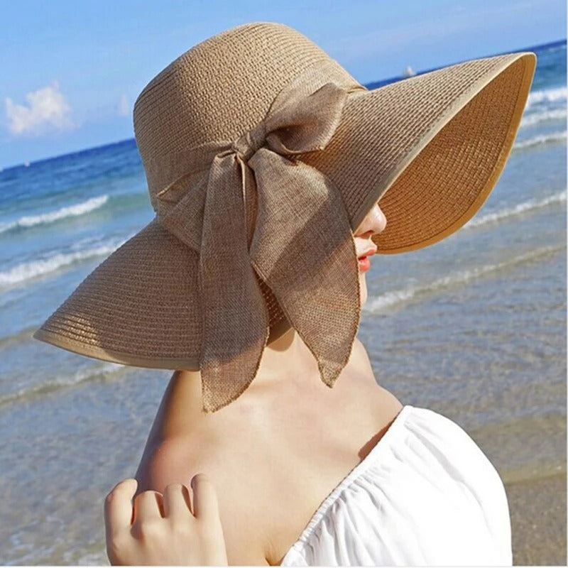 Detalhe: Faixa com laço, aba larga e dobrável.