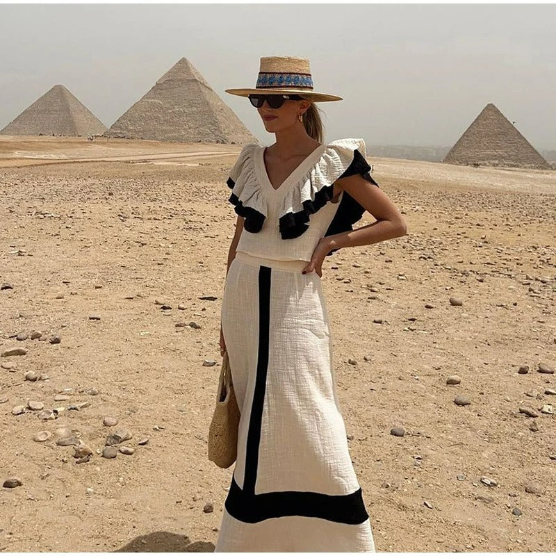 Detalhe: Blusa com babados em camadas, saia midi, detalhes em preto ou branco e saia com fenda sutil.