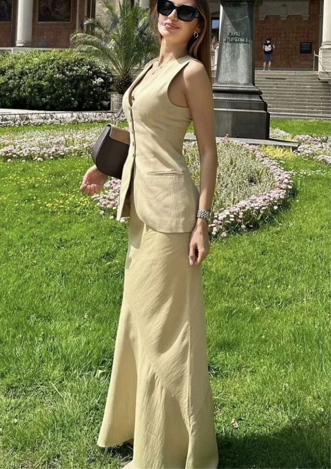 Detalhe: Tecido estruturado, saia longa, botões frontais, gola V.