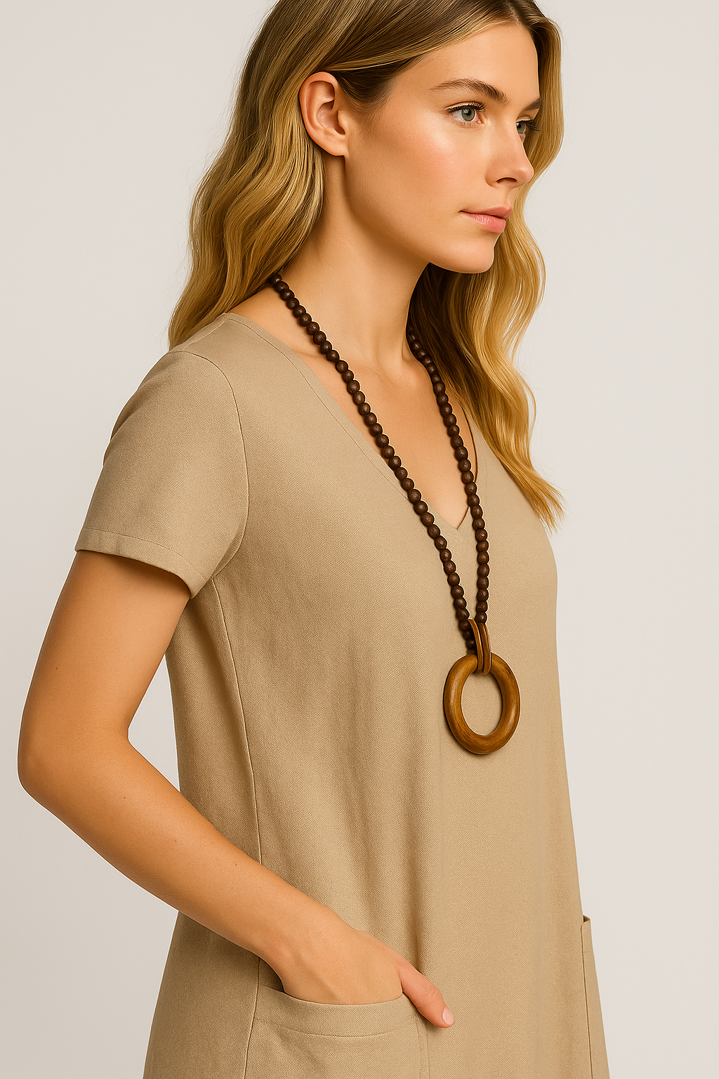 Vestido midi de manga curta em linho com algodão, apresentando bolsos frontais e decote redondo. Com saia ampla e fluida, esse vestido oferece um visual casual elegante. Feito com tecido encorpado e confortável, o Vestido Lavínia Midi é perfeito para destacar sua beleza em qualquer ocasião.